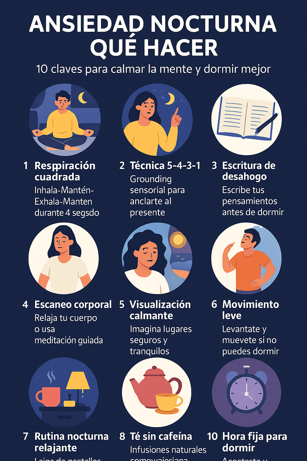 🌙 Ansiedad Nocturna Qué Hacer: 10 Claves para Calmar la Mente y Dormir Mejor ❓ ¿Qué es la ansiedad nocturna y por qué aparece por la noche? La ansiedad nocturna es una sensación de nerviosismo, tensión o miedo que se intensifica al llegar la noche, justo cuando el cuerpo intenta relajarse y dormir. Es común