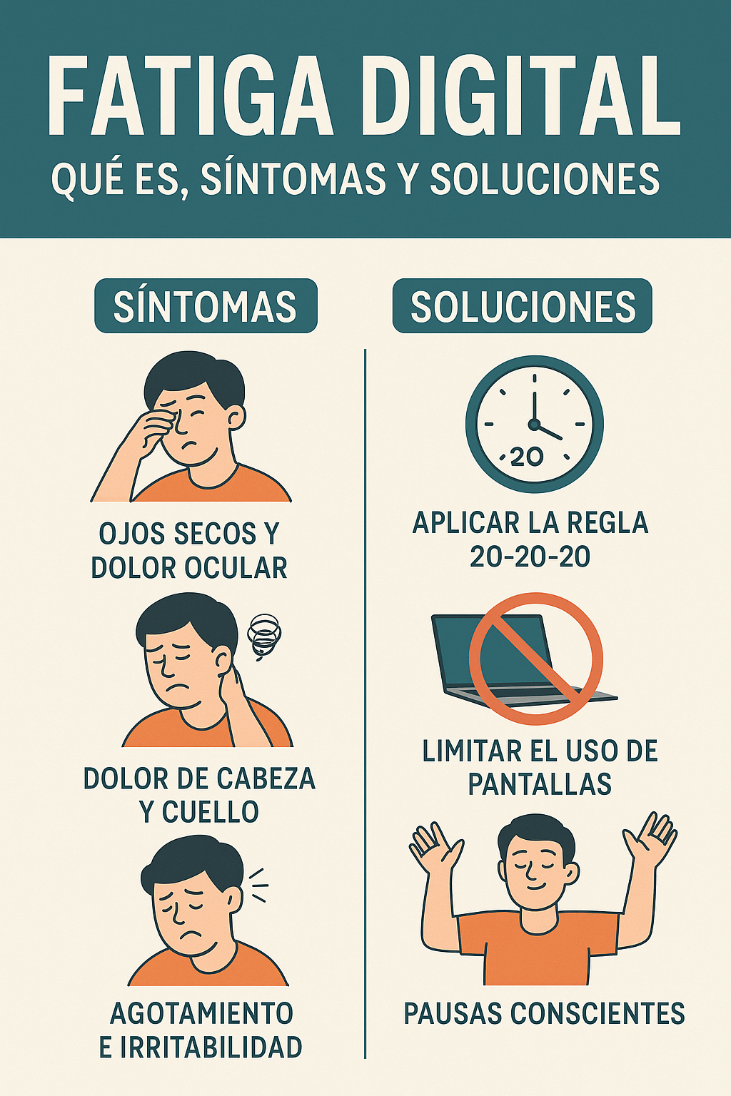 💻 Fatiga Digital Qué Es: Causas, Síntomas y Cómo Combatirla en la Era de las Pantallas Vivimos en un mundo conectado 24/7. Las pantallas están en el trabajo, el ocio, la comunicación… y aunque facilitan muchas cosas, también pueden pasar factura a nuestra mente y cuerpo. Aquí entra en juego un término cada vez más
