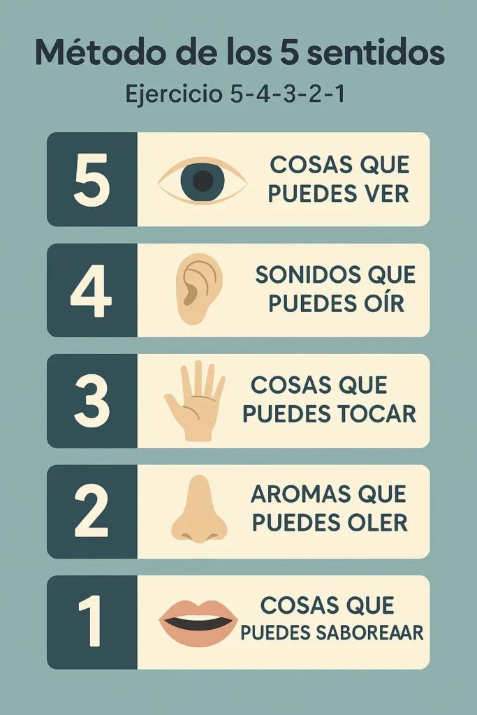 Es una práctica de atención plena que consiste en conectar con tu entorno a través de tus cinco sentidos: vista, oído, tacto, olfato y gusto. Esta técnica ayuda a calmar la mente, reducir la ansiedad y mejorar el enfoque. Se conoce también como ejercicio 5-4-3-2-1 por la secuencia con la que se realiza.